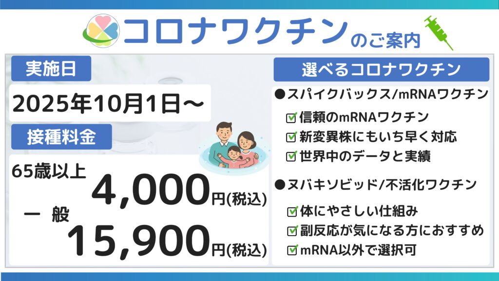 当院では、コロナワクチンをご予約なしで当日接種いただけます。接種をご希望の方は、受付時間内にご来院ください。